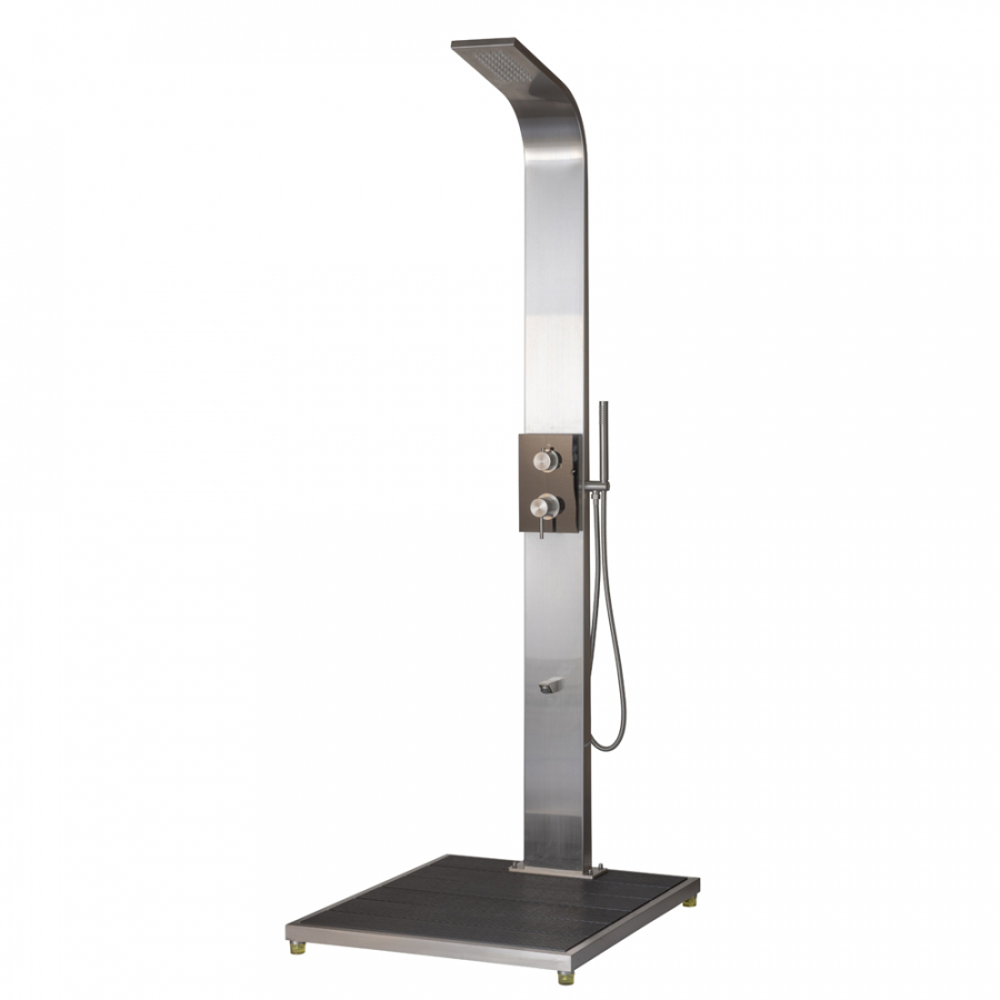 Diese hochwertige Dusche besteht aus Edelstahl V4A, einem besonders robusten und korrosionsbeständigen Material. Die Armaturen sind aus verchromtem Messing gefertigt, während die Bodenplatte aus WPC-Dielen mit Edelstahlrahmen besteht, was für zusätzliche Stabilität sorgt. Die Handbrause besteht aus verchromtem Kunststoff.