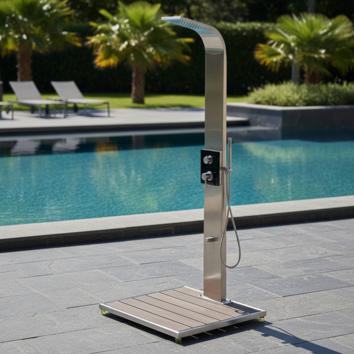 Diese hochwertige Dusche besteht aus Edelstahl V4A, einem besonders robusten und korrosionsbeständigen Material. Die Armaturen sind aus verchromtem Messing gefertigt, während die Bodenplatte aus WPC-Dielen mit Edelstahlrahmen besteht, was für zusätzliche Stabilität sorgt. Die Handbrause besteht aus verchromtem Kunststoff.