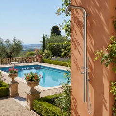Die Gartendusche Sylt ist aus Edelstahl V2A gefertigt und besticht durch eine Edelstahlsäule mit 6 cm Durchmesser. Gekrönt wird die hochwertige Säule von einem 6 cm großen Duschkopf. Die Armaturen bestehen aus gebürstetem verchromtem Messing.