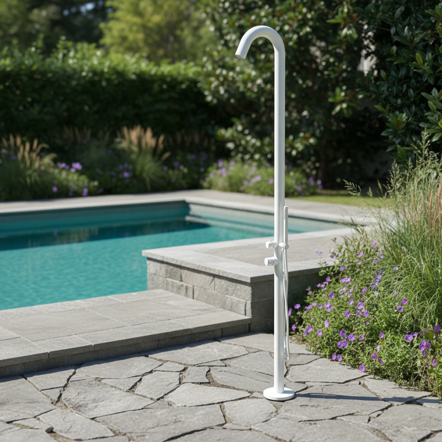 Die Gartendusche Sylt Weiß von Ideal bietet eine harmonische Kombination aus Design und Funktionalität. Mit ihrer robusten Bauweise aus hochwertigem Edelstahl V4A verkörpert sie Langlebigkeit und Eleganz. Diese Dusche ist speziell für den Einsatz in privaten Schwimmbädern und Gärten konzipiert und verleiht jedem Außenbereich einen Hauch von Luxus. Ausgestattet mit einer Einhebel-Mischbatterie sowie einem Umsteller für die Kopf- und Handbrause garantiert sie ein angenehmes Duscherlebnis.
