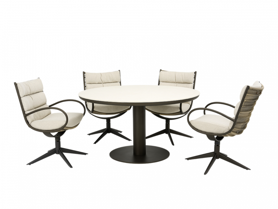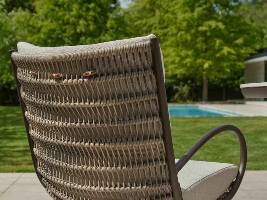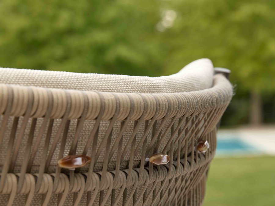Das Gartenmöbel-Set setzt auf eine sorgfältige Materialauswahl für eine lange Nutzungsdauer im Freien. Das Geflecht in der Farbe Teak Grey sorgt für eine naturnahe, zeitlose Optik. Im Inneren der Sitz- und Rückenkissen befindet sich ein Quick Dry Schaumstoff, der durch seine spezielle Struktur eine schnelle Trocknung ermöglicht. Die Tischplatte aus High pressure laminate stone in der Farbgebung Oyster ist pflegeleicht. Das Gestell in Bronze rundet das Gesamtbild mit einer eleganten, warmen Metalloptik ab.