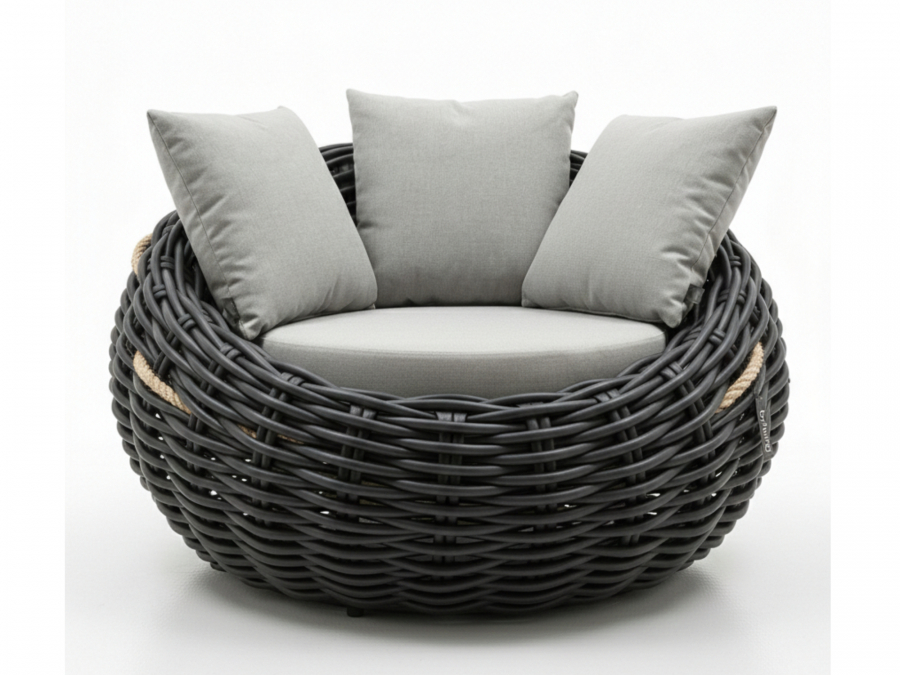 Der Loungesessel Cocoon kombiniert ein pulverbeschichtetes Aluminium-Gestell mit einem Rundgeflecht aus Polyrattan. Das Rundgeflecht besitzt eine Materialstärke von ca. 20 mm und ist in der Farbe Black Wash ausgeführt. Diese Materialien sind auf eine Nutzung im Freien ausgelegt und zeichnen sich durch hohe Formstabilität aus. Die Kissenbezüge bestehen aus etwa 100 % Olefin und bieten eine angenehme Haptik bei gleichzeitig guter Wetterbeständigkeit. Das eingeflochtene Sisalseil verleiht dem Loungesessel einen naturnahen und zugleich modernen Charakter, der sich harmonisch in Outdoor-Ambiente einfügt.