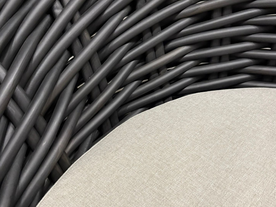 Das Gestell besteht aus pulverbeschichtetem Aluminium, das für Stabilität bei gleichzeitig moderatem Gewicht sorgt. Die Bespannung erfolgt mit einem ca. 20 mm starken Rundgeflecht aus Polyrattan in der Geflechtfarbe Black Wash. Diese Verarbeitung verleiht dem Sessel seine charakteristische Optik und macht ihn zugleich widerstandsfähig gegen äußere Einflüsse. Eingeflochtenes Sisalseil setzt optische Akzente und unterstreicht den hochwertigen Manufaktur-Charakter des Möbelstücks.