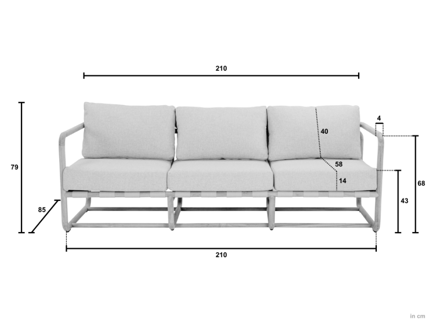 Das Apple Bee Loungesofa 3-Sitzer Dolce bietet mit einer Gesamtbreite von ca. 210 cm und einer Gesamttiefe von ca. 85 cm ausreichend Platz für drei Personen. Die Sitzhöhe von ca. 43 cm sorgt für ein bequemes Aufstehen und Hinsetzen. Mit einer Gesamthöhe inklusive Kissen von ca. 79 cm vermittelt das Loungesofa eine angenehme, lässige Loungeposition. Das Gewicht von ca. 49,2 kg verleiht dem 3-Sitzer Sofa einen stabilen Stand, ohne die Möglichkeit zum Umstellen im Garten oder auf der Terrasse einzuschränken. Diese ausgewogenen Proportionen machen das Modell zum Zentrum einer komfortablen Outdoor-Sitzgruppe, die sich beispielsweise mit dem Apple Bee Dolce 2-Sitzer Loungesofa 141cm Teak Kissen grau zu einer Loungegruppe oder mit dem Apple Bee Dolce Armlehnstuhl Teakholz Grau für eine optisch passende Dining-Gruppe stilvoll ergänzen lässt.