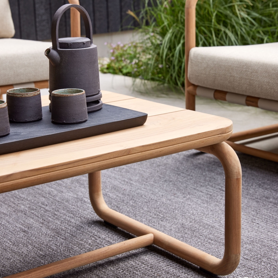 Der Apple Bee Kaffeetisch Dolce wird aus hochwertigem Teakholz gefertigt, das in naturbelassener Ausführung verarbeitet ist. Das Material zeichnet sich durch seine dichte Struktur und seinen ölhaltigen Kern aus, wodurch der Tisch von Natur aus witterungsbeständig ist. Die natürliche Oberfläche unterstreicht den warmen Holzton und entwickelt mit der Zeit eine charaktervolle Patina, wenn das Teakholz unbehandelt im Freien genutzt wird. Dadurch eignet sich der Gartentisch ideal für Terrasse, Balkon oder Gartenlounge.