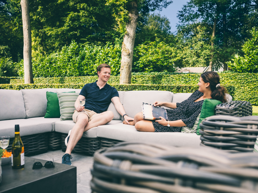 Zusätzlich können Sie das Sofa mit schönen Zierkissen aufwerten und für einen zusätzlichen Schutz unserer Gartenmöbel haben wir passende Schutzhauben für Sie.