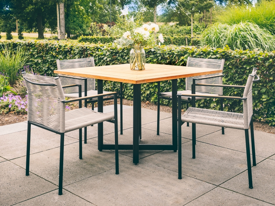 Das Apple Bee Jakarta Dining-Set 3 grey ist ein hochwertiges Gartenmöbel-Set der Serie Jakarta und verbindet modernes Design mit langlebigen Materialien. Es umfasst einen quadratischen Esstisch und vier komfortable Stühle und ist damit ideal für gesellige Runden im Freien. Die klare Linienführung und die harmonische Farbkombination von schwarzem Gestell, grauer Bespannung und warmem Teakholz fügt sich stilvoll in viele Outdoor-Bereiche ein.