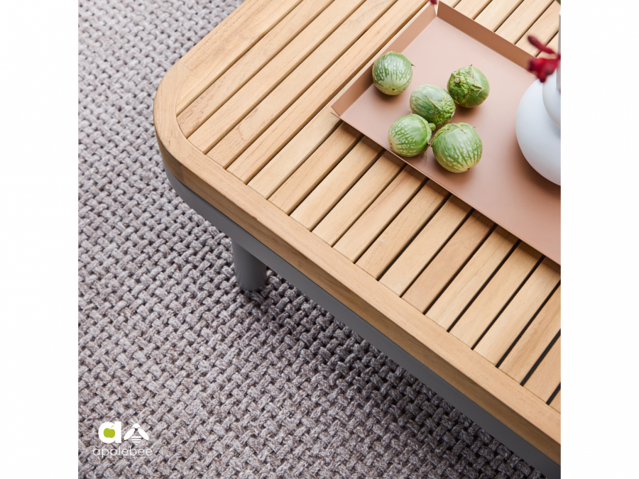Zum Apple Bee Maui-Lugano Lounge-Set gehören eine komfortable Chaise Lounge mit angestelltem Sofa, ein praktischer Kaffeetisch mit Teakplatte im Maß 85x85cm sowie ein passender Sessel. Die Kombination dieser Module ermöglicht eine entspannte Sitzgruppe für Familie und Gäste. Das durchdachte Layout des Loungemöbel-Set schafft ausreichend Sitzfläche, ohne den Außenbereich zu überladen und lässt sich mit passenden Ergänzungen wie [[Beistelltisch-Serie]] oder [[Lounge-Hocker]] weiter ausbauen.