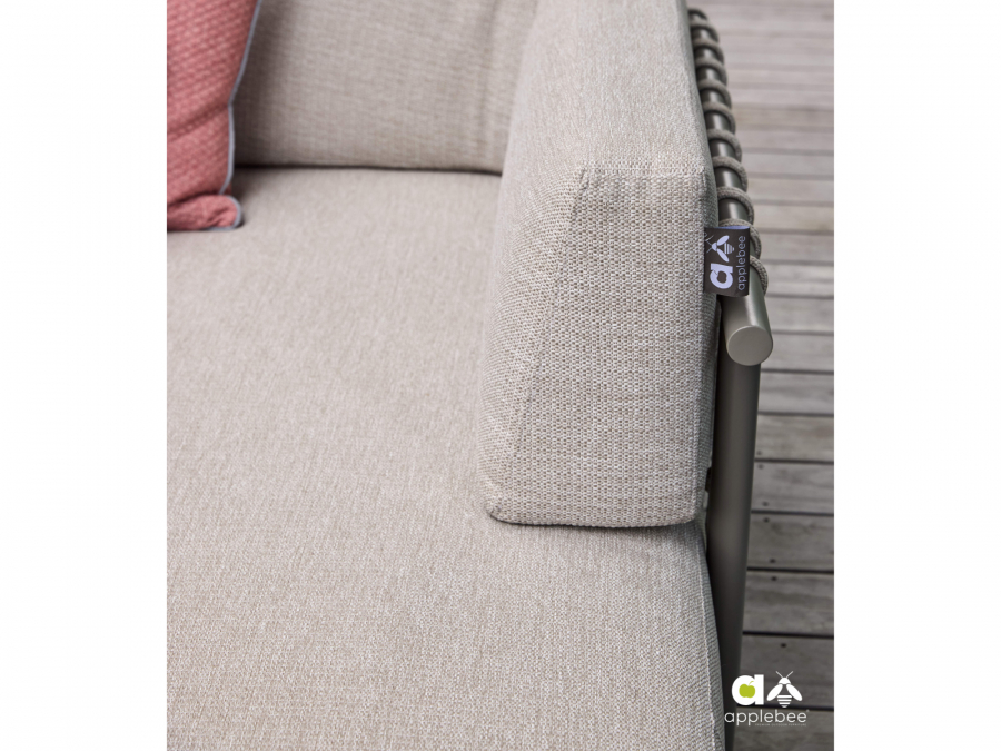 Das Apple Bee Maui-Lugano Lounge-Set setzt auf ein robustes Aluminiumgestell mit hochwertiger pulverbeschichteter Oberfläche in der Gestellfarbe Taupe. Diese Konstruktion sorgt für Stabilität, geringes Gewicht und eine moderne Optik. Das Geflecht in der Geflechtfarbe Mid grey besteht aus strapazierfähigem Rope, das dem Loungemöbel-Set eine optisch ansprechende Struktur verleiht. Die Polster in der Farbe Smoked grey sind mit einem Outdoor-Gewebe bezogen, das speziell für den Einsatz im Freien entwickelt wurde. Laut Textilkennzeichnung besteht der Polsterbezug zu ca. 100 % Olefin, einem robusten, farbbeständigen und pflegefreundlichen Synthetikmaterial, das optimal zu anspruchsvollen Outdoor-Anwendungen passt.