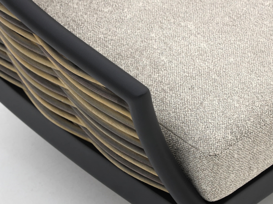 Beim Apple Bee Loungesofa Milou kommen langlebige und witterungsbeständige Materialien zum Einsatz. Das Geflecht besteht aus einem 10 mm starken Rundgeflecht aus Polyrattan in der Farbe Willow, das speziell für den Einsatz im Freien ausgelegt ist. Das Gestell wird aus pulverbeschichtetem Aluminium gefertigt und in der Farbe Schwarz ausgeführt, was für Stabilität und Korrosionsbeständigkeit sorgt. Die bequemen Polster sind mit einem robusten Outdoor-Gewebe bezogen, das als UV-beständig beschrieben wird. Der Kissenbezug besteht zu ca. 100 % aus Olefin, einem strapazierfähigen Outdoor-Textil mit hoher Formstabilität und guter Wetterbeständigkeit.