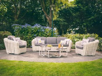 Das Palm Bay-Soul Lounge-Set von Apple Bee ist einzigartig und wird Sie mit seinen ausgewählten Materialien und Formen beeindrucken. Das ca. 20mm starke Rundgeflecht in der Farbe white wash ist um ein wetterfestes Aluminiumgestell geflochten und gibt den Möbeln eine sowohl robuste als auch weiche Ausstrahlung. Aus den Serien Palm Bay und Soul stammend, ist dieses Lounge-Set eine Bereicherung für jeden Garten.