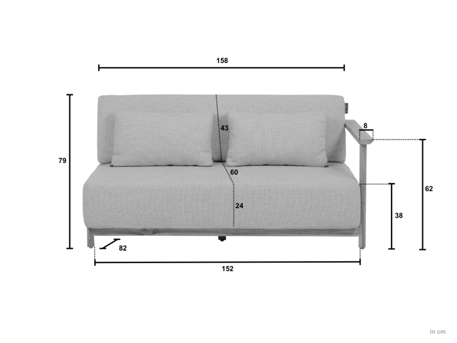 Das Apple Bee St. Lucia Loungesofa links bietet mit einer Gesamtbreite von ca. 158 cm und einer Gesamttiefe von ca. 82 cm angenehmen Platz für zwei Personen. Die Sitzhöhe von ca. 38 cm sorgt für einen entspannten, loungeartigen Sitzkomfort, während die Armlehnenhöhe von ca. 62 cm eine bequeme Unterstützung bietet. Das Sitzpolster ist mit einer Höhe von ca. 24 cm großzügig dimensioniert und trägt zum hohen Komfort des 2-Sitzer Sofa bei. Mit einem Gewicht von ca. 35,9 kg steht das Lounge Modul stabil und sicher, lässt sich aber bei Bedarf dennoch im Garten oder auf der Terrasse umplatzieren.