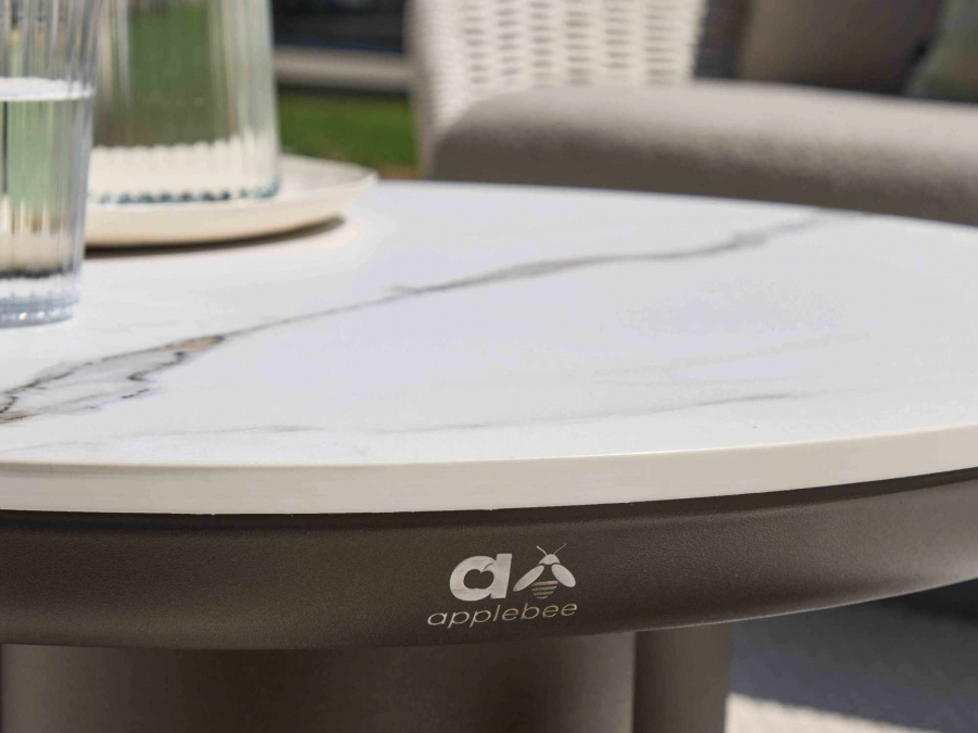 Das Gestell des Apple Bee Tonga Lounge-Tisch besteht aus hochwertigem Aluminium, das für Langlebigkeit und Stabilität im Außenbereich bekannt ist. Durch die pulverbeschichtete Oberfläche erhält das Gestell einen zusätzlichen Schutz gegen Witterungseinflüsse sowie eine ansprechende, gleichmäßige Optik in der Farbe Bronze. Die Tischplatte wird aus HPMS Stein gefertigt, der einen hochwertigen Look bietet und zugleich für pflegeleichte Nutzung ausgelegt ist. Die Farbgebung der Tischplatte in Marmor unterstreicht den eleganten Charakter und sorgt für einen wertigen Gesamteindruck, der sich stimmig mit weiteren Outdoormöbeln ergänzen lässt.
