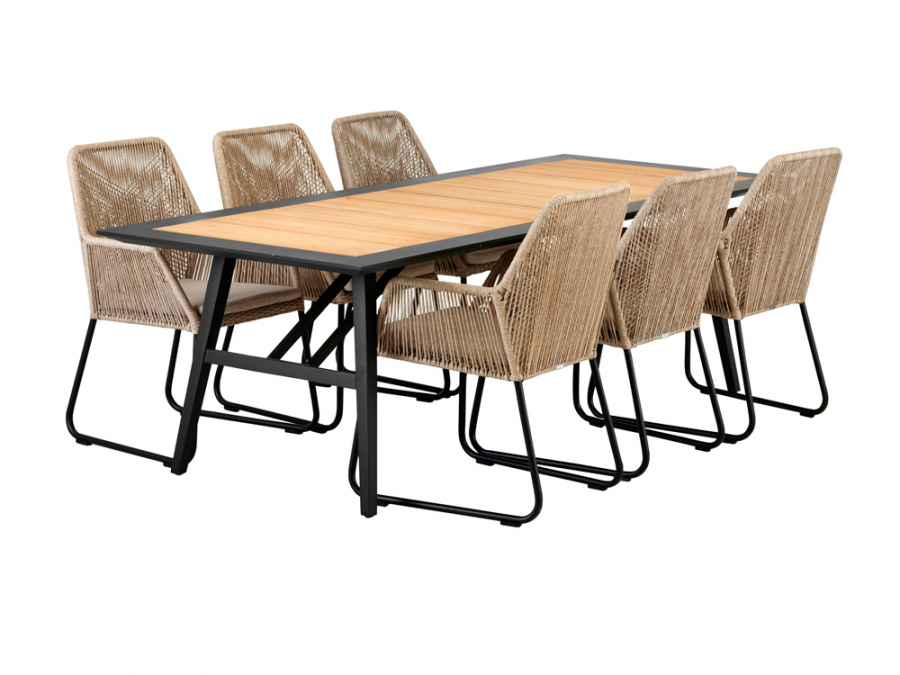 Das Chios-Midway Set besteht aus dem Chios Tisch und sechs Midway Stühlen, die mit dem beigen Geflecht eine perfekte Kombination aus Stil und Komfort bieten. Für zusätzlichen Komfort sind die Stühle schon mit Kissen ausgestattet. Jeder Gegenstand in dem Set wurde sorgfältig ausgewählt und designt, um Ihnen das bestmögliche Produkt zu liefern.
