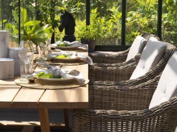 Dieser Gartenstuhl ist ideal für Terrassen, Gärten, Balkone oder Wintergärten geeignet. Die rustikale Geflechtoptik passt besonders gut zu naturnahen Outdoor-Gestaltungen, lässt sich aber ebenso mit modernen Elementen wie Metall- oder Glasflächen kombinieren. Als Teil der Serie Lenora kann der Brafab Lenora Dining-Sessel mit weiteren Gartenmöbeln aus dem Brafab-Sortiment kombiniert werden, sodass ein einheitlicher Ess- und Loungebereich entsteht. Zusammen mit weiteren Stücken und Accessoires wie Holz-Tischen entsteht ein funktionaler, komfortabler und optisch ansprechender Outdoor-Essplatz.
