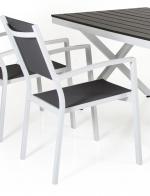 Der Diningsessel aus dem Hause Brafab punktet mit der bewährten Materialkombination aus Aluminium und Textil. Das pulverbeschichtete Aluminiumgestell in Weiß bildet den robusten Rahmen für die graue Textil-Bespannung der Sitzfläche. Durch diese Materialauswahl ist der Gartenstuhl besonders langlebig und witterungsbeständig.