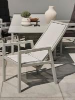 Die robuste und witterungsbeständige Struktur des Stuhls wird durch das pulverbeschichtete Aluminiumgestell gewährleistet. Die Bespannung besteht aus kunststoffummanteltem Polyestergarn und ist damit genauso wetterbeständig wie das Gestell. Das Resultat ist ein langlebiges Produkt, das Sie für viele Jahre begleiten wird.