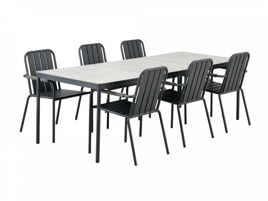 Die Sitzgruppe Nox-Innes zeichnet sich durch eine Kombination aus strapazierfähigem Metall und Aluminium aus. Diese Materialzusammenstellung gewährleistet sowohl Langlebigkeit als auch Stil. Der Tisch und die Stühle sind mit einer robusten Bespannung versehen, die zusätzlichen Komfort und eine ansprechende Ästhetik bietet.