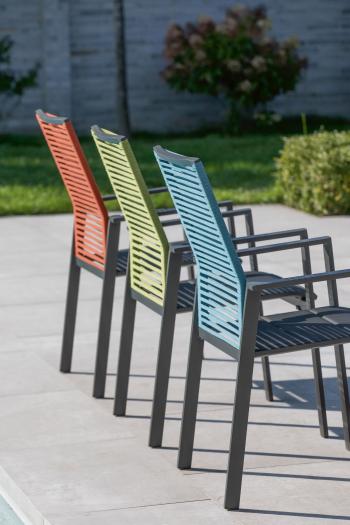 Niehoff Hochlehnstuhl Cervo. Die Stühle mit roter und grüner Kordelbespannung sind nicht im Lieferumfang enthalten.
