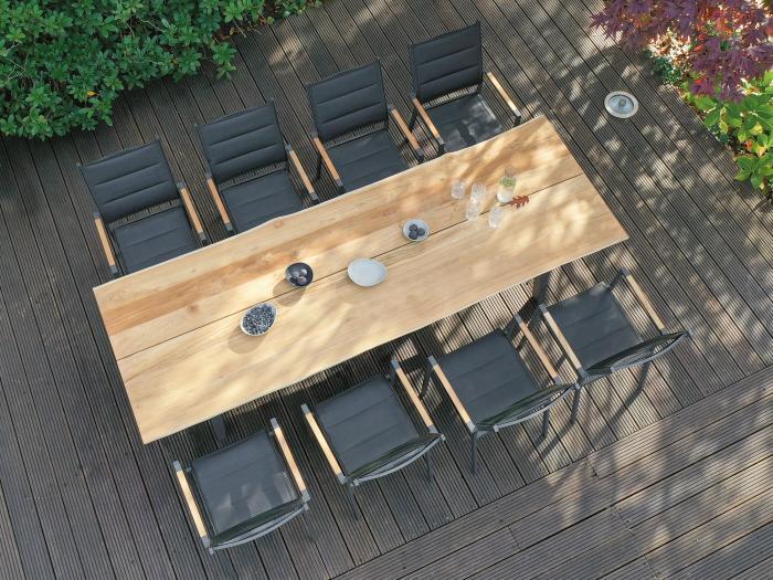 Ein Stück Natur bringt der Gartentisch Tavo vom Hersteller Niehoff zusätzlich in Ihren Garten. Die Tischplatte aus zwei massiven Teakholzplanken ist mit der belassenen Baumkante ein echtes Unikat. Das gebürstete Teakholz rückt, mit der charakterischen Struktur des Stammes, in den Vordergrund. Ein Gestell aus leichtem Aluminium erzielt mit der anthrazitfarbenen Pulverbeschichtung einen schönen Kontrast.