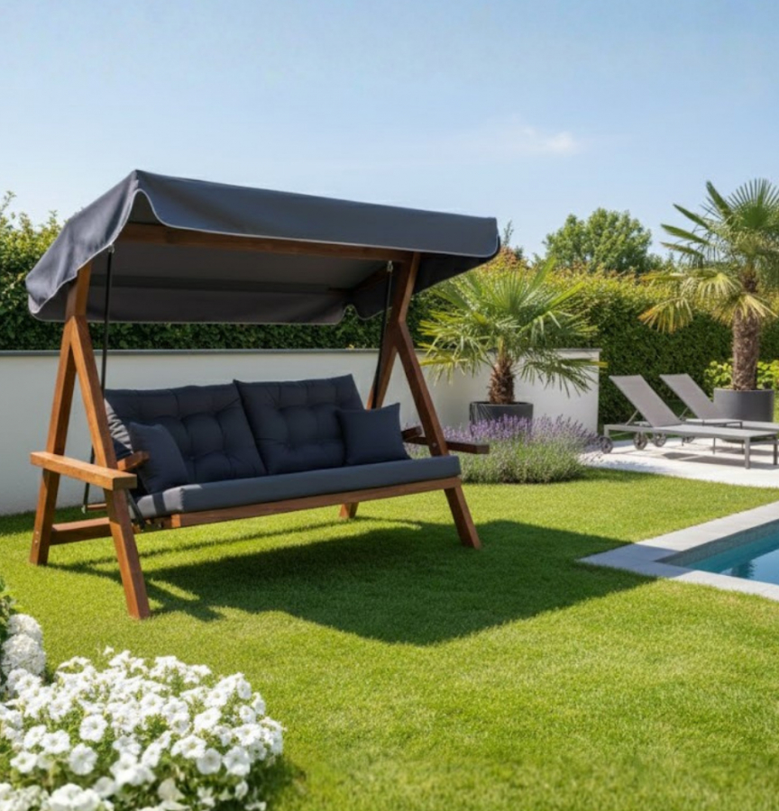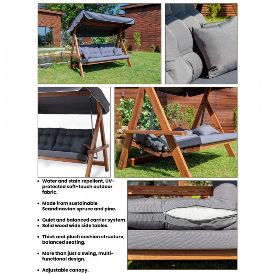 Das Gestell der Hollywoodschaukel besteht aus hochwertigem Kiefernholz und Fichte, das in einem attraktiven braunen Farbton gehalten ist. Es fügt sich harmonisch in jede Gartengestaltung ein und verleiht dem Außenbereich eine organische und natürliche Note. Das Holz ist bekannt für seine Robustheit und Langlebigkeit, weshalb es ideal für den Einsatz im Freien geeignet ist.