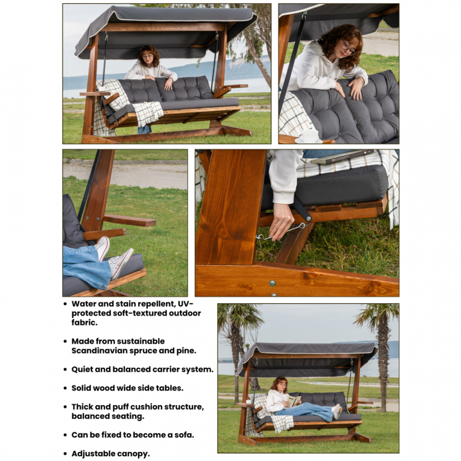 Nicht nur der Ausdruck von Eleganz und Exklusivität, sondern auch das außergewöhnliche Komforterlebnis macht den Charme dieser Hollywoodschaukel aus. Ihr stabiles Gestell aus Fichte und Kiefernholz, in ansprechendem Braunton gehalten, verleiht dem Produkt sowohl die notwendige Stabilität als auch ein attraktives Design. Das Gestell harmoniert perfekt mit der Farbgebung des abnehmbaren, schwenkbaren und UV-Schutz bietenden Sonnendachs, sowie der Polster, die beide aus Outdoor-Gewebe in elegantem Anthrazit gefertigt sind.
