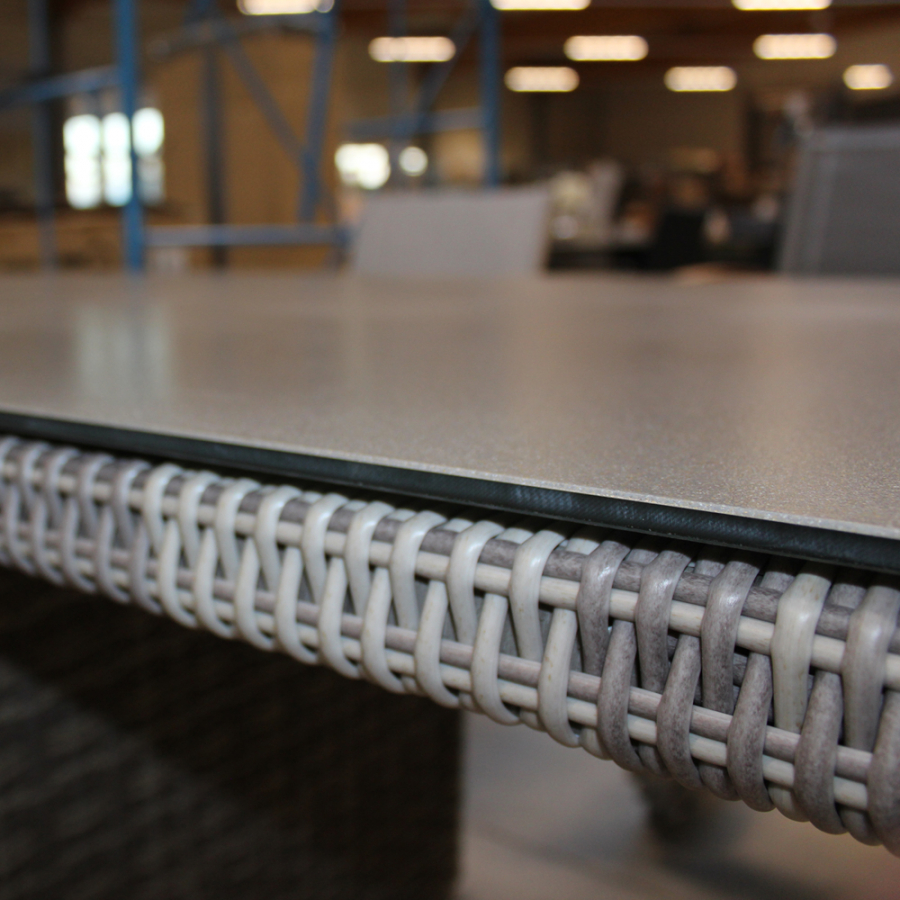 Der Ploß Sahara Diningtisch verfügt über ein stabiles Aluminium-Gestell, das für eine hohe Formstabilität und ein vergleichsweise geringes Gewicht sorgt. Das Gestell ist pulverbeschichtet und damit optimal für den dauerhaften Einsatz im Freien vorbereitet. Die Bespannung aus doppel-halbrund geflochtenem Polyrattan in beiger Geflechtfarbe verleiht dem Tisch eine moderne, naturnahe Optik und macht ihn zugleich besonders robust. Die Tischplatte besteht aus Glas, das in edler Steinoptik ausgeführt ist und damit einen stilvollen Akzent in Ihrem Außenbereich setzt. Die Kombination aus Aluminium, Polyrattan und Glas macht den Sahara Diningtisch langlebig, pflegeleicht und optisch vielseitig kombinierbar, mit passenden oder einer bereits bestehenden Sitzgruppe.