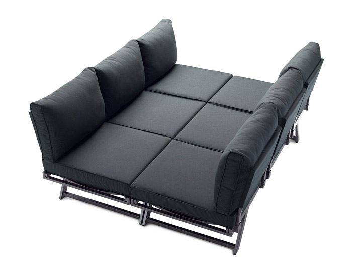 Die verstellbaren äußeren Sitzflächen ermöglichen unterschiedliche Liegepositionen, sodass sowohl aufrechte Sitzpositionen als auch entspannte, halb liegende oder voll liegende Positionen möglich sind. Dadurch lässt sich der vorhandene Raum effizient nutzen und flexibel an die jeweilige Situation anpassen, sei es zum Lesen, Entspannen oder für die Nutzung mit weiteren Elementen wie einem [[Beistelltisch]].