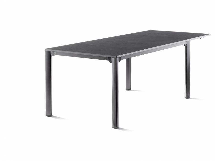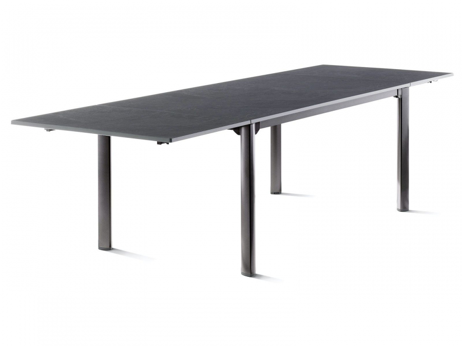 Die Materialkombination des Sieger Exclusiv-Tisch verlängerbar 165-225-285x95cm ist konsequent auf Langlebigkeit und Pflegeleichtigkeit ausgelegt. Das Gestell besteht aus robustem Aluminium mit strapazierfähiger Polyesterbeschichtung in eisengrauer Farbgebung. Diese Beschichtung trägt zur hohen Witterungsbeständigkeit bei und erleichtert die Reinigung im Alltag. Die Tischplatte ist aus Vivodur gefertigt, einem speziellen Pressspanträger mit duroplastischem Material und Melaminbeschichtung. Das dekorative Schiefer-Dekor in Anthrazit verleiht dem Gartentisch eine edle Steinoptik, bleibt dabei jedoch deutlich leichter und pflegefreundlicher als Naturstein. Die Materialwahl macht den Tisch ideal für den Dauereinsatz im Garten, auf der Terrasse oder auch auf geräumigen Balkonen.