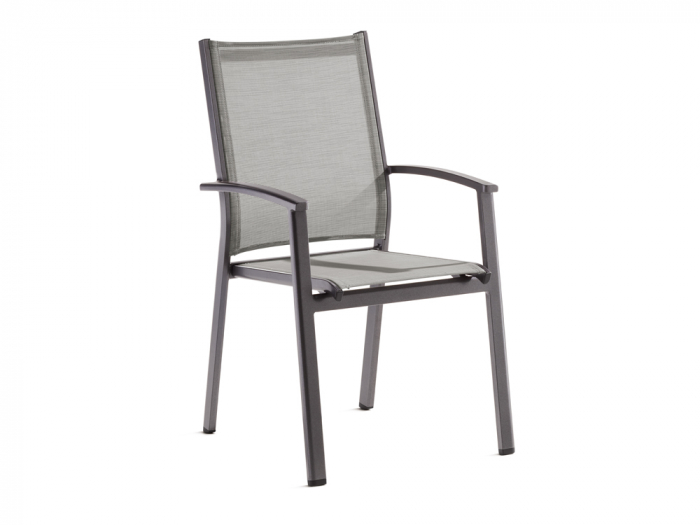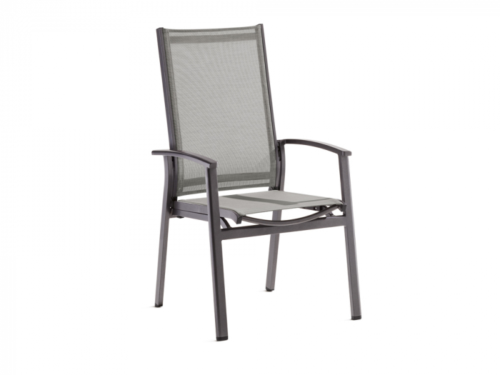 Die Tischplatte besteht aus widerstandsfähigem Polytec in der Farbe Beton dunkel. Dieses Material ist besonders pflegeleicht, kratzunempfindlich und auf den dauerhaften Einsatz im Freien ausgelegt. Die hellgraue Gewebefarbe der Bespannung bildet einen dezenten Kontrast zum eisengrauen Untergestell und rundet das moderne Erscheinungsbild des Gartenmöbel-Set harmonisch ab.
