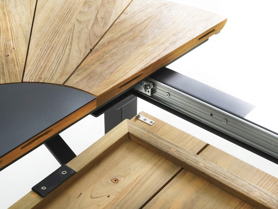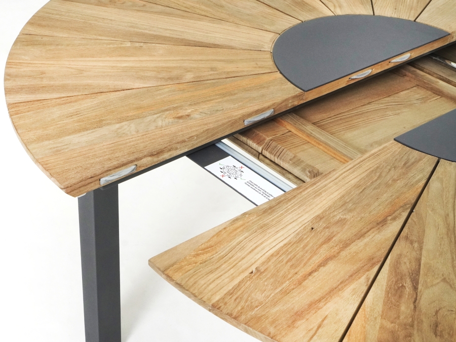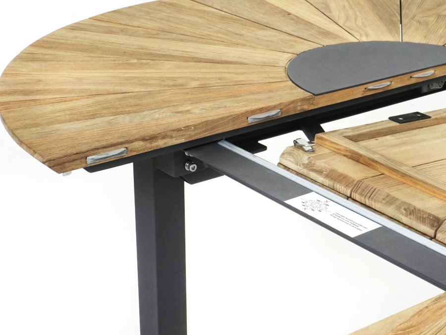 Der Zebra Catax Ausziehtisch graphit aus recyceltem Teak 135x135-185cm verfügt über einen praxistauglichen Synchronauszug. Diese ausziehbar konzipierte Mechanik ermöglicht ein komfortables Verlängern der Tischplatte von ca. 135 cm auf ca. 185 cm. Durch den Synchronauszug bewegen sich die Tischhälften gleichzeitig und gleichmäßig, sodass sich die Vergrößerung der Nutzfläche einfach und ohne großen Kraftaufwand umsetzen lässt. Der Gartentisch lässt sich so schnell an unterschiedliche Nutzungssituationen anpassen, von der alltäglichen Nutzung bis hin zu größeren Runden bei Gartenfeiern oder geselligen Abenden im Freien. Die stabile Konstruktion und das hohe Eigengewicht unterstützen dabei eine sichere Handhabung der Auszugsfunktion.