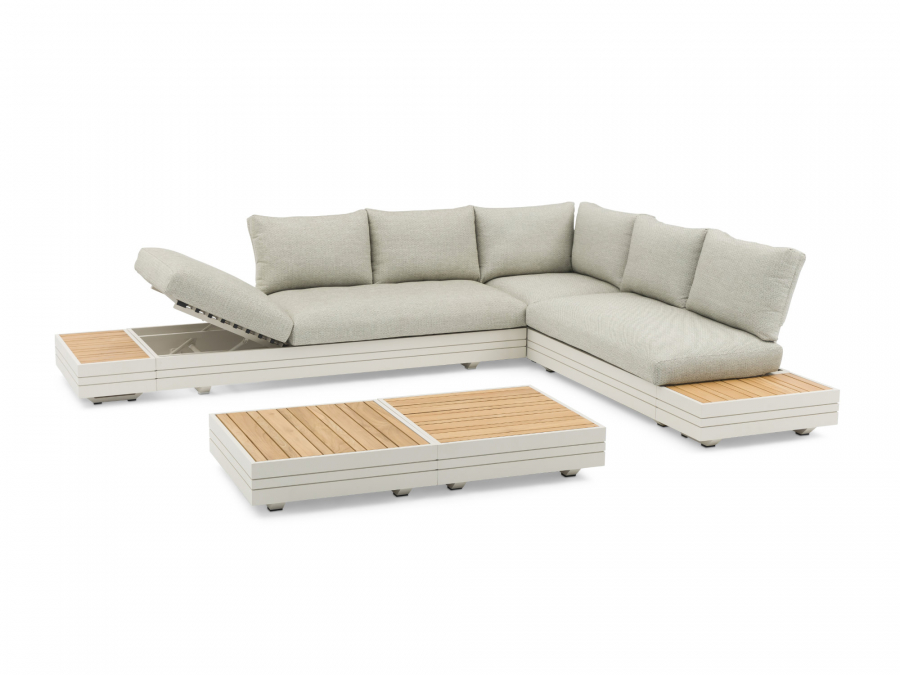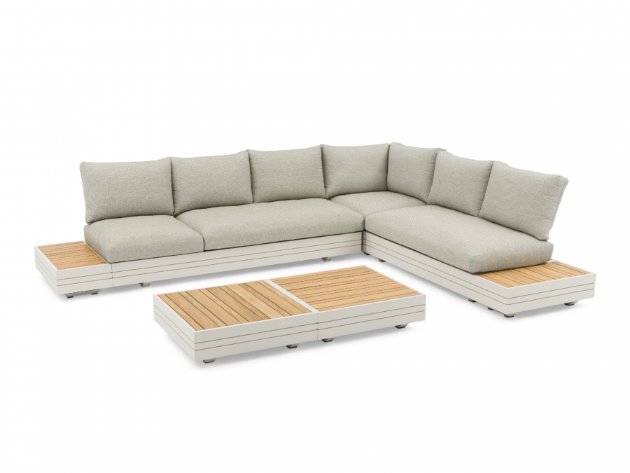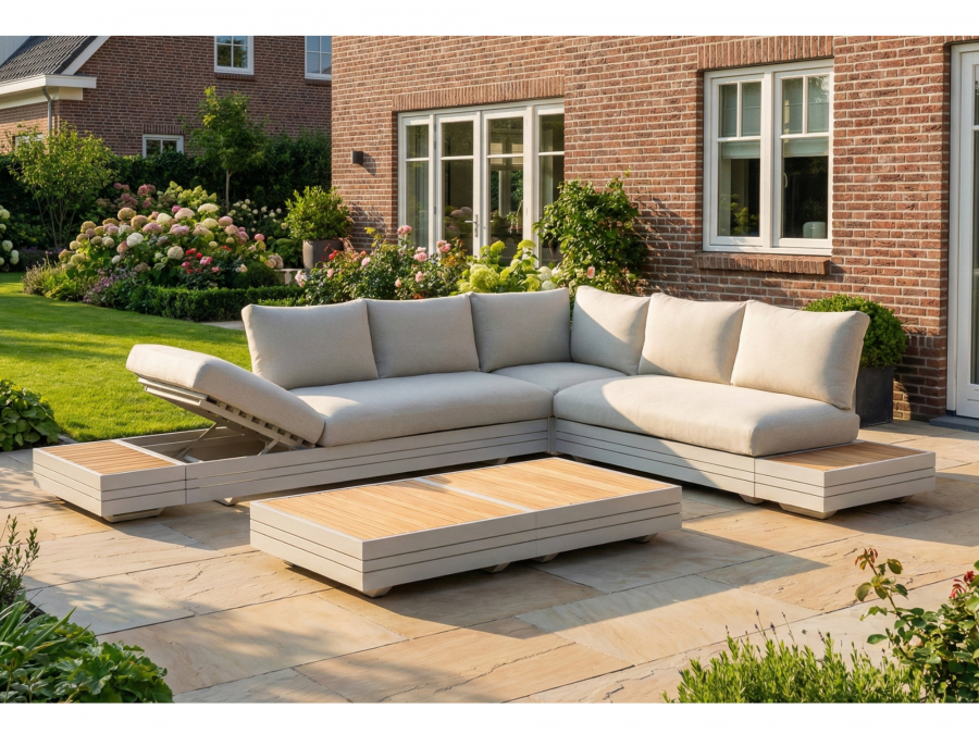 Beim Zebra Cubo Neo Lounge Set steht die Materialqualität im Vordergrund. Das Gestell wird aus stabilem Aluminium gefertigt und ist pulverbeschichtet, was die Oberfläche widerstandsfähig gegenüber Witterungseinflüssen macht. Die Tischplatte besteht aus hochwertigem Teakholz, das für seine robuste Struktur und die charakteristische Holzoptik im Outdoor-Bereich geschätzt wird. Die Polster in der Farbe Cashmir bildet einen weichen Kontrast zu den klaren Linien des Gestells.