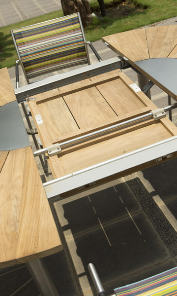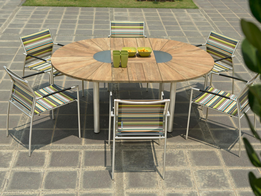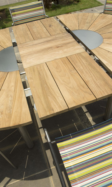 Bei dieser Sitzgruppe bildet der Ausziehtisch Catax den Mittelpunkt. Die Tischbeine aus Edelstahl und die Tischplatte aus recyceltem Teakholz bilden einen modernen Materialmix. Sechs Stapelsessel Rovex vervollständigen die Gartenmöbel Garnitur Catax-Rovex von Zebra. Textilarmlehnen vermeiden überhitzte Edelstahlarmlehnen. Die Bespannung aus hochwertigem Batyline-Gewebe passt sich dem Körper ideal an.