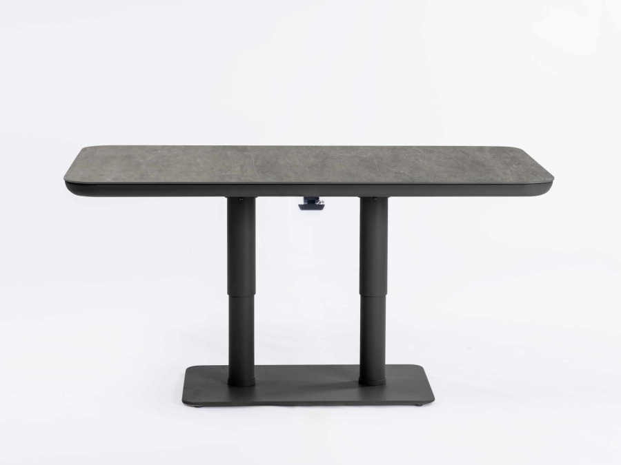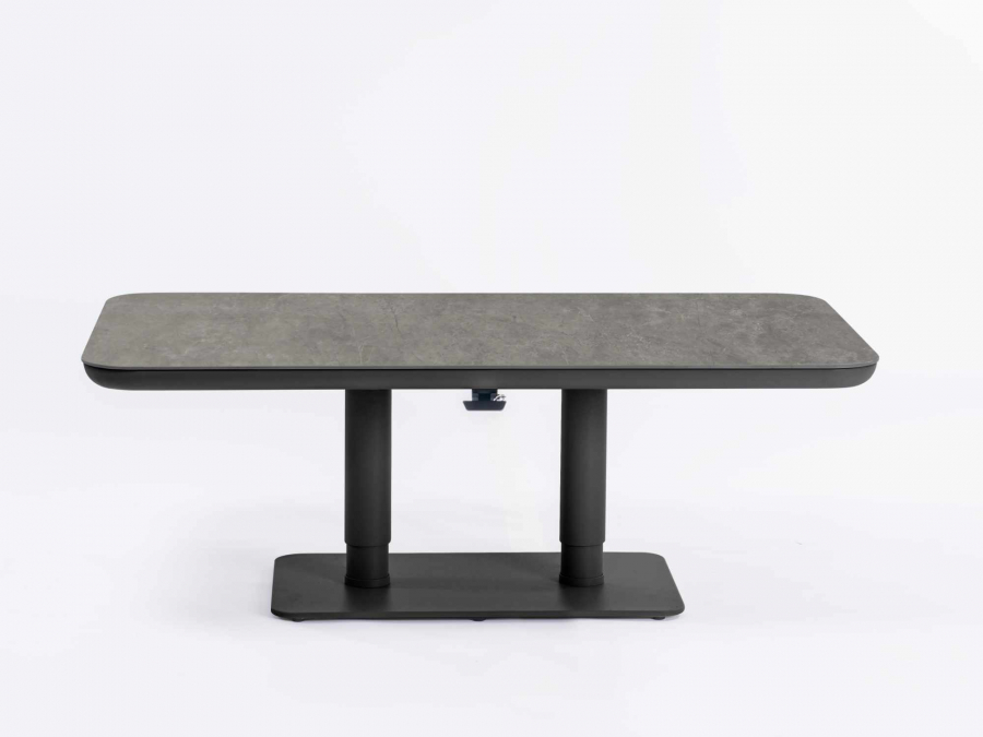 Der Zebra Tisch Move verfügt über ein robustes Gestell aus Aluminium, das pulverbeschichtet ist. Diese Konstruktion sorgt für Stabilität bei gleichzeitig moderatem Gewicht, sodass sich der Tisch leicht innerhalb unterschiedlicher Bereiche versetzen lässt. Die pulverbeschichtete Oberfläche des Gestells in der Farbe Graphit bietet zusätzlichen Schutz vor äußeren Einflüssen und unterstreicht die moderne Optik. Die Tischplatte besteht aus pflegeleichtem Keramik und ist in der Farbvariante Shadow ausgeführt, die eine dezente, hochwertige Steinoptik vermittelt. Keramik ist abriebfest, hart und unempfindlich gegenüber üblichen Beanspruchungen im Außenbereich, was die Reinigung und Pflege deutlich erleichtert.