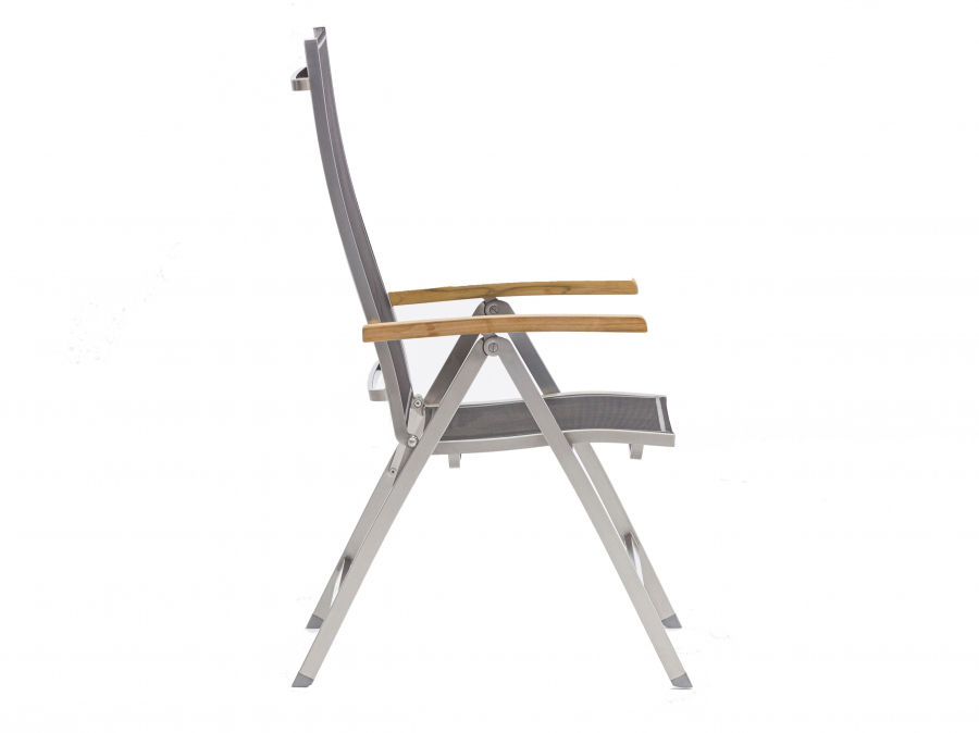 Der Klappsessel One von Zebra verbindet hochwertige Materialien mit maximaler Funktionalität. Der robuste, gebürstete Edelstahl des Gestells garantiert die Langlebigkeit des Produkts, während die Armlehnen aus Teakholz einen Hauch von Eleganz verleiht. Der Sessel ist mit einer hochwertigen Textil-Bespannung bezogen, die nicht nur für Komfort sorgt, sondern auch den dunkelplatinfarbenen Aspekt des Klappsessels hervorhebt.