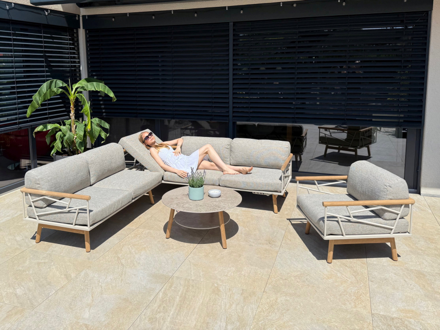 Der Solena Lounge Kaffeetisch von Zebra verfügt über ein robustes Gestell aus Teakholz, das für seine natürliche Widerstandsfähigkeit im Außenbereich bekannt ist. Die Tischplatte aus Keramik in der Farbvariante Trilium ist besonders pflegeleicht, kratzunempfindlich und beständig gegen Witterungseinflüsse. Diese Materialkombination macht den Beistelltisch zu einer langlebigen Lösung für Terrasse, Garten oder Balkon.