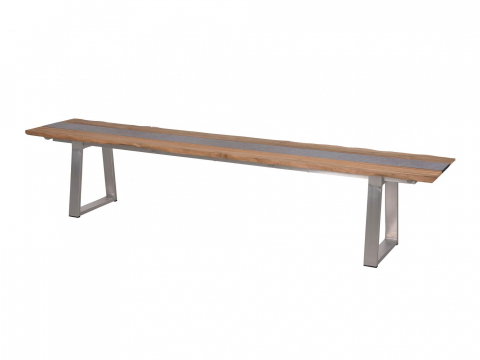 Das Gestell dieser herausragenden Bank ist aus Edelstahl gefertigt, einem robusten Material, das für seine Strapazierfähigkeit und Widerstandsfähigkeit gegen Rost und Verwitterung bekannt ist. Die Sitzfläche aus recyceltem Teakholz und HPL (High Pressure Laminate) fügt einen Hauch von Eleganz und Nachhaltigkeit hinzu. Diese Kombination aus Materialien macht die Bank nicht nur optisch ansprechend, sondern auch ökologisch verantwortungsbewusst.