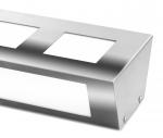 Die CMD Wandleuchte aus der Serie Aqua Trilo zeichnet sich durch ihre präzise Handwerkskunst und hochwertige Materialien aus. Sie besteht aus anthrazit pulverbeschichtetem Edelstahl mit einer Blende aus Opalglas. Die drei Lichtausschnitte auf der Vorderseite und die Seitenausschnitte sind ebenfalls aus Opalglas gefertigt, das eine weiße, leicht transparente Folie enthält. Dadurch wird das Licht sanft gefiltert und eine angenehme, indirekte Beleuchtung erzeugt, ohne das verwendete Leuchtmittel sichtbar zu machen.