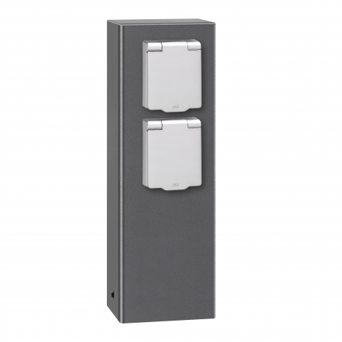 Die LCD Steckdosensäule 2-fach 018 graphit ist hervorragend gegen Umwelteinflüsse geschützt. Ausgestattet mit einem IP44 Schutzfaktor, ist sie widerstandsfähig gegen Fremdkörper ab 1mm Durchmesser und allseitiges Spritzwasser. So hält sie Wind und Wetter stand, ohne dabei an Leistung zu verlieren.