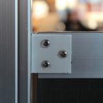 Die Vorgartenzäune aus WPC werden mit Hilfe von Metallwinkeln zwischen die Pfosten gehängt. Der entsprechende Beschlagsatz beinhaltet neben den Winkeln auch die notwendigen Schrauben. Ein Schenkel des Befestigungswinkels ist auf der Rückseite des Zaunrahmens sichtbar. Der auf dem Aluminiumpfosten befestigte Schenkel des Winkels ist von der Vorderseite des Zaunes teilweise sichtbar.