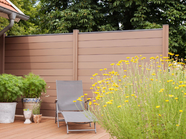 Die Serie Groja Solid besteht aus BPC, einem Material aus Bambusfasern und Kunststoff. Die Zaunelemente sind extrem pflegeleicht, witterungsbeständig und besonders langlebig. Zum Lieferumfang der Serie gehören zwölf robuste BPC-Profile, eine Abdeckleiste in Anthrazit sowie zwei Distanzstücke. Die Farbe Terra ist ein warmer Braunton, der die natürliche Holzoptik unterstreicht und sich harmonisch in jeden Garten einfügt.
