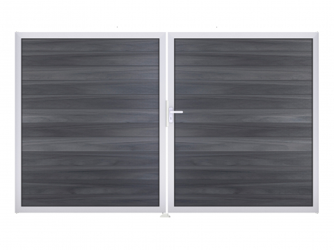 Die Füllung dieses hochwertigen Doppeltors besteht aus BPC, einem robusten Materialmix aus ca. 60% Bambus und 40% Kunststoff. Umhüllt ist diese Füllung mit einer zusätzlichen Kunststoffummantelung, die coextrudiert wurde. Der Rahmen des Tors ist aus hochwertigem, eloxiertem Aluminium gefertigt.