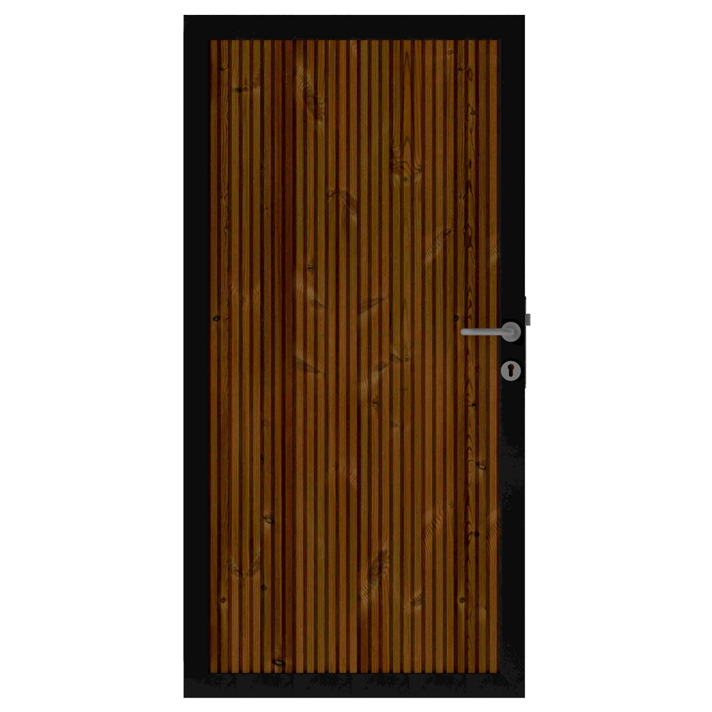 Im Lieferumfang des Osmo Trio Thermoholz Kiefer Einzeltor Sondermaß sind ein passendes Schließblech, ein Schloss, Bänder sowie ein funktionaler Griff enthalten.
