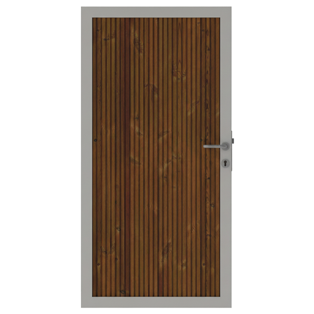 Das Osmo Trio Thermoholz Kiefer Einzeltor Sondermaß besteht aus thermisch behandeltem Kiefernholz in Kombination mit einem robusten Aluminium-Rahmen. Das thermisch behandelte Nadelholz sorgt für eine verbesserte Formstabilität und hohe Beständigkeit gegen Witterungseinflüsse. Die Füllung aus formschönen Lamellen verleiht dem Tor eine moderne, elegante Optik und trägt gleichzeitig zur Privatsphäre bei.