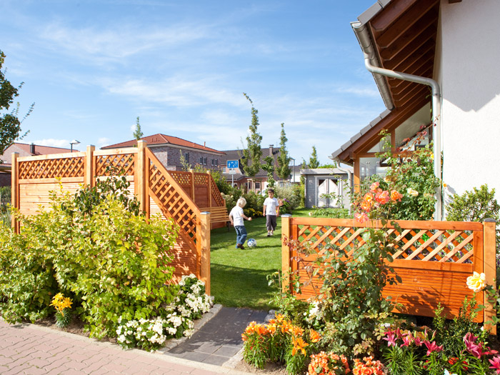 Der Sichtschutzzaun von Traumgarten Arzago besteht aus Nadelholz, das offenporig farbig lasiert wurde. Dieses Material bietet den Vorteil, dass es wetterfest ist, was für eine hohe Langlebigkeit des Zauns sorgt. Darüber hinaus unterstreicht die braune Lasur die natürliche Schönheit des Holzes und setzt warme Akzente in Ihrem Garten.