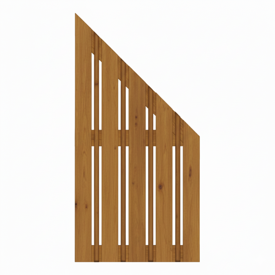 Der Massivzaun ist als einseitig abgeschrägtes Element konzipiert, wodurch die Höhe von ca. 180 cm auf ca. 90 cm abfällt und sich der Zaun ideal für saubere Abschlusslösungen eignet, etwa an Terrassen oder Gartenzugängen. Die senkrechten Lamellen mit verschiedenen Breiten bilden eine moderne, klare Linienführung. Die Füllung besteht aus Profilen, die durch ihre Anordnung ein harmonisches Gesamtbild erzeugen und gleichzeitig stabilen Sichtschutz bieten. Die Naturoptik der Farbgebung in Natur lässt sich vielseitig mit weiteren Elementen der Serie kombinieren, etwa mit Zaunpfosten aus Lärche mit Rundkopf 9x9x195cm oder den passenden Verbindungselementen wie Maschinenschraube 10x110mm - verzinkt mit Mutter.
