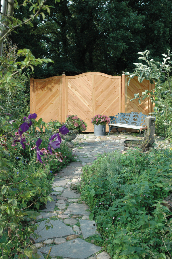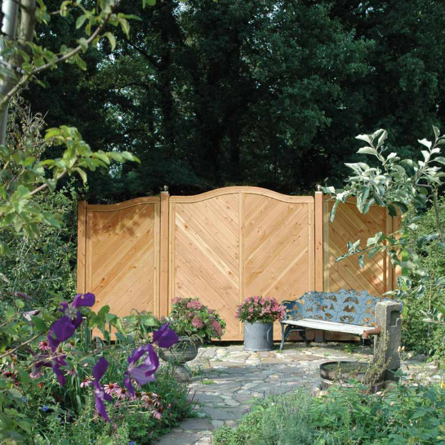 Der Sichtschutzzaun Lido Kreonenbogen Lärche-Douglasie 180x180/165cm vereint funktionalen Sichtschutz mit einer langlebigen, durchdachten Konstruktion. Die Kombination aus naturbelassenem Holz, diagonaler Fischgerätfüllung, stabilem Mittelsteg und Edelstahl-Verbindungen sorgt für eine hohe Widerstandsfähigkeit gegen Witterungseinflüsse. Die klare Profiloptik und der dekorative Kronenbogen machen dieses Hauptelement der Serie Lido zu einer passenden Lösung für anspruchsvolle Gartenbesitzer, die Wert auf Qualität, Stabilität und ein harmonisches Gesamtbild ihres Sichtschutzzaun-Systems legen.